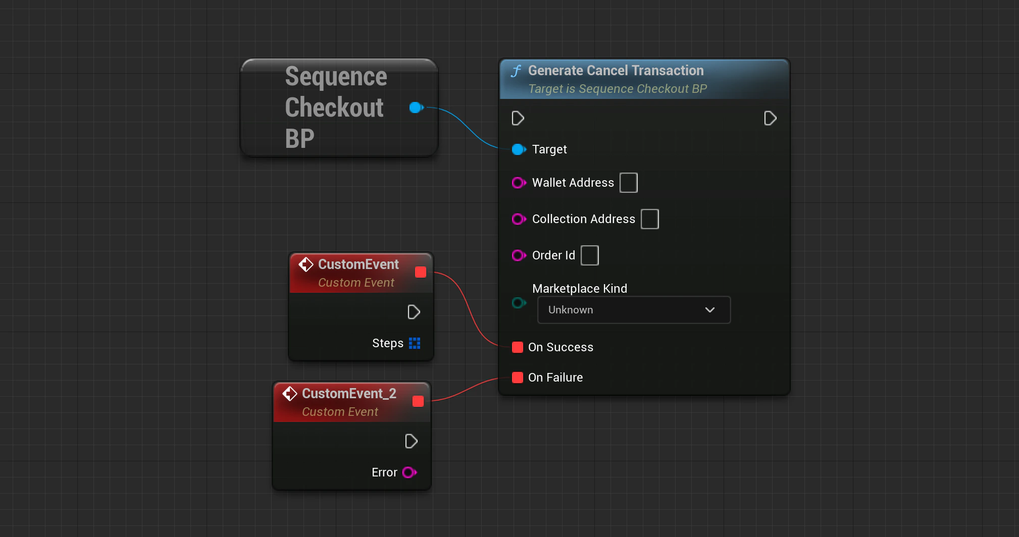 Checkout->GenerateCancelTransaction(SequenceSdk::GetChainId(), WalletAddress, CollectionAddress, OrderId, MarketplaceKind, OnApiSuccess, OnApiFailure);