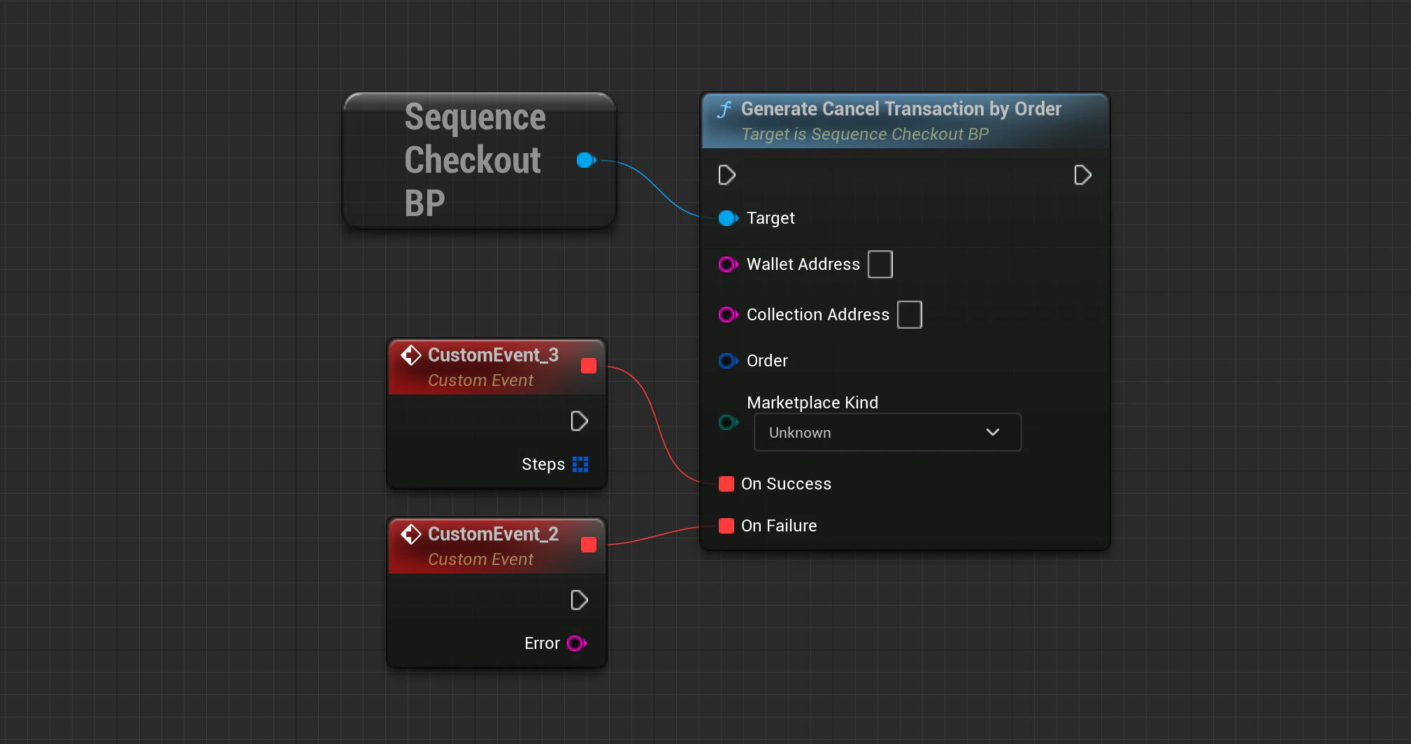 Checkout->GenerateCancelTransactionByOrder(SequenceSdk::GetChainId(), WalletAddress, CollectionAddress, Order, MarketplaceKind, OnApiSuccess, OnApiFailure);