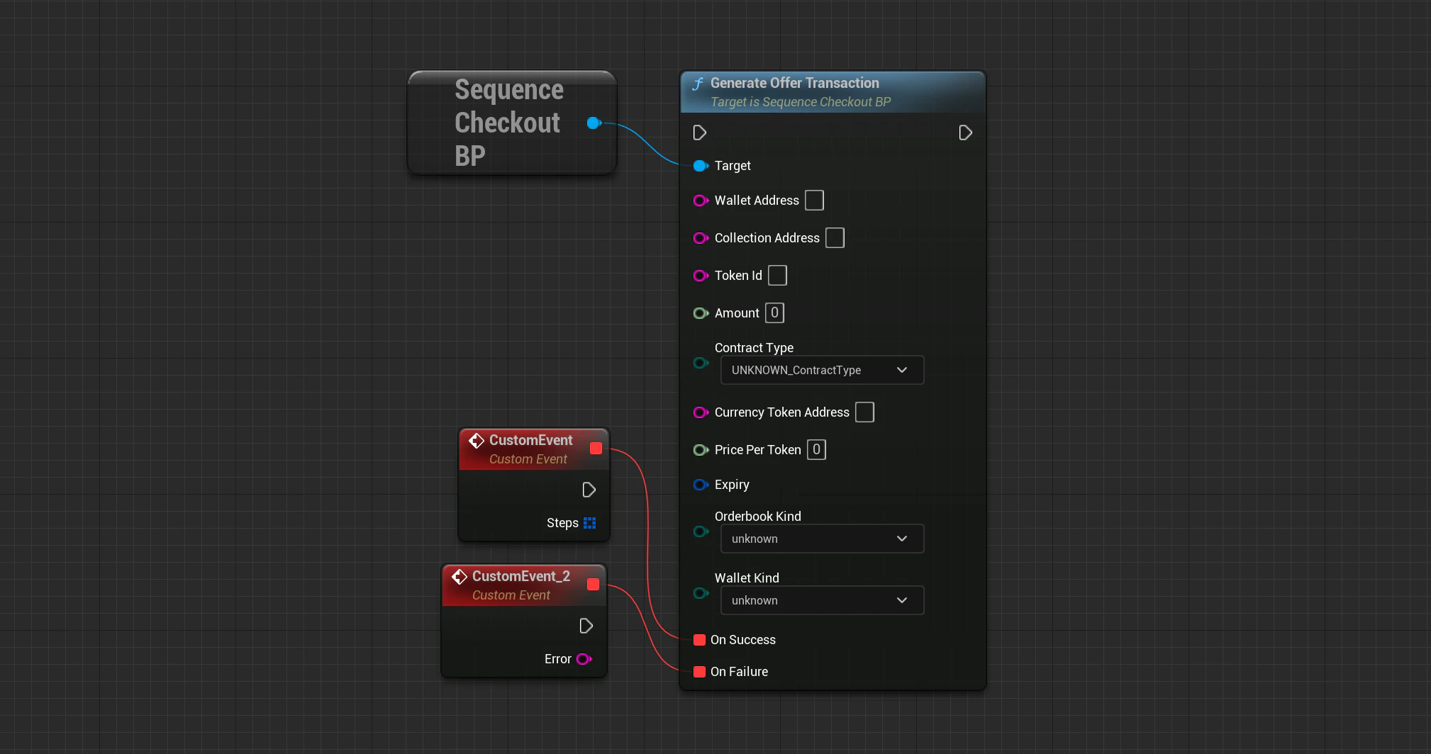 Checkout->GenerateOfferTransaction(SequenceSdk::GetChainId(), WalletAddress, CollectionAddress, TokenId, Amount, ContractType, CurrencyTokenAddress, PricePerToken, Expiry, OrderbookKind, WalletKind, OnApiSuccess, OnApiFailure);