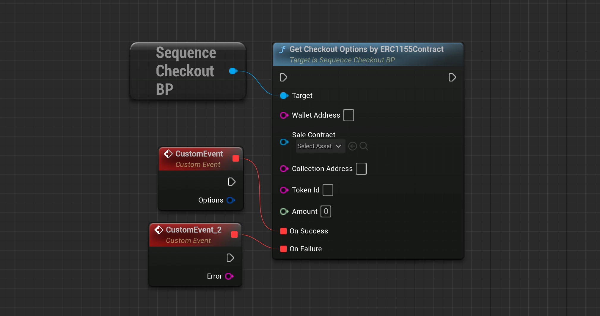 Checkout->GetCheckoutOptionsByERC1155Contract(SequenceSdk::GetChainId(), WalletAddress, SaleContract, CollectionAddress, TokenId, Amount, OnApiSuccess, OnApiFailure);