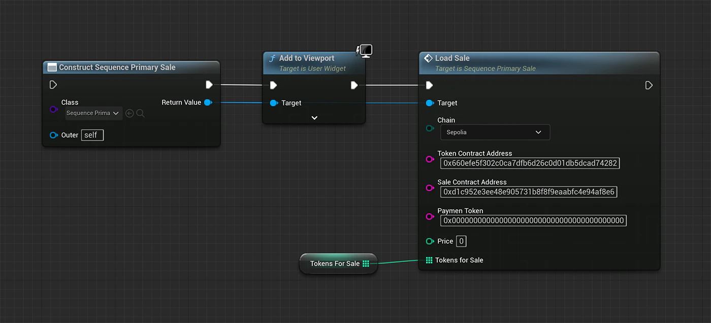 Chain (ENetwork Enum)The chain type (Ethereum, Sepolia, ..) on which the specified contract is deployed.Token Contract Address (FString)The address of the ERC1155 or ERC721 token contract you deployed using Sequence’s Builder.Sale Contract Address (FString)The address of the sale contract you deployed using Sequence’s Builder.Payment Token (FString)The ERC20 token address you specified on the ‘Mint Access’ section of your Sale contract.Price (Integer)The price for each token you specified on the ‘Mint Access’ section of your Sale contract.Tokens for Sale (Integer Array)A list of token IDs (e.g. [0, 1, 2]) that you display in your user interface.