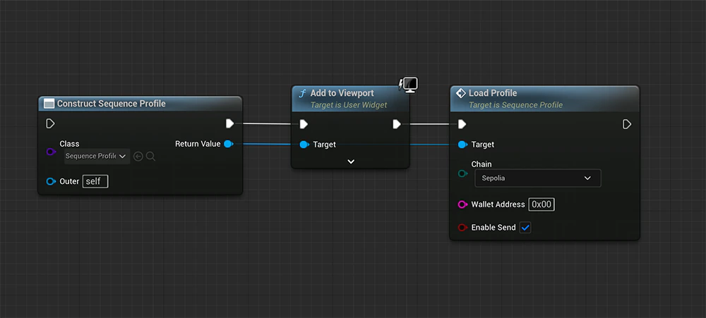 Chain (ENetwork Enum)The chain type (Ethereum, Sepolia, ..) where you want to run your game.Wallet Address (FString)The wallet address of the user for whom you want to display this view.Enable Send (Boolean)Indicates whether to enable the button to open a send view. Set this to false if you want to display the profile of another user.
