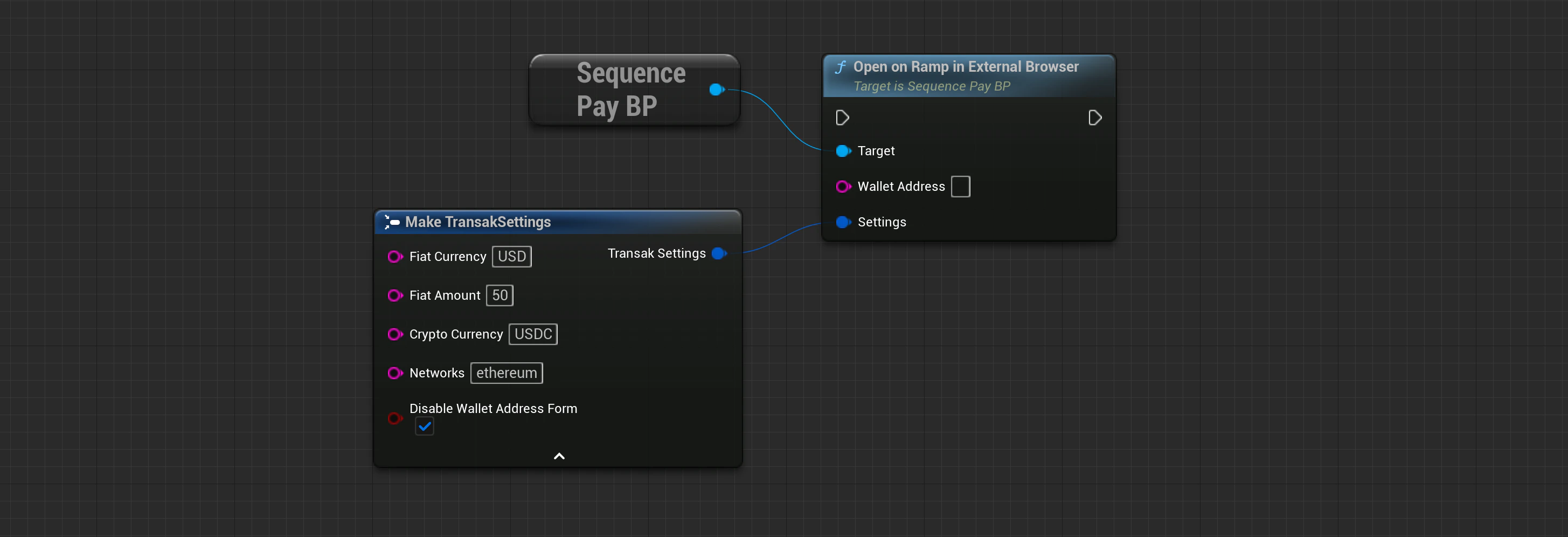 Wallet Address (FString)The address of the user who receives the purchased amount of cryptocurrency.Fiat Currency (FString)The default fiat currency displayed in the On-Ramp modal.Fiat Amount (FString)The default fiat amount displayed in the On-Ramp modal.Crypto Currency (FString)The cryptocurrency the user is allowed to purchase.Networks (FString)List of networks the user can select, separated by a comma. For example: ‘ethereum, mainnet’.Disable Wallet Address Form (Boolean)Set this value to ‘false’ to allow users to edit their wallet address.